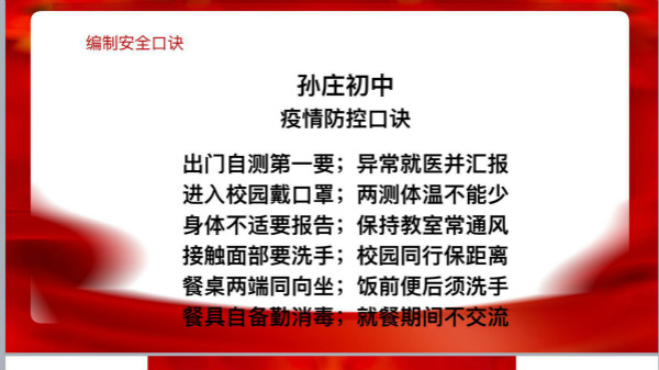 班主任利用班会课向学生播放安全防护知识视频,讲解个人防护知识:如“七步洗手法”“如何正确佩戴口罩”“如何正确处理使用过的口罩”等内容,进一步提高全体学生的防疫思想认识。发放《孙庄初中疫情防控安全口诀》,要求每位学生认真阅读学习,做到熟透于心,知行合一。