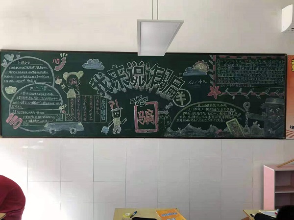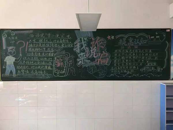 学校德育处、团支部还布置各班级出了一期“我来说诈骗”专题教育黑板报。11月2日下午组织由学校行政人员和教师、学生代表组成的评审组从主题表现、图文协调、版面设计等方面进行量化考核评比,评定等次,并给获得优秀等次的班级颁发了奖励证书。这些由学生自己设计完成的黑板报卓有成效地帮助同学们增强了“识诈、防诈、反诈、拒诈”的知识、意识与能力。